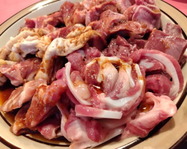 大皿に盛り盛りの、カシラ、ホルモン、タン、ネック、ハツ、ナンコツ!