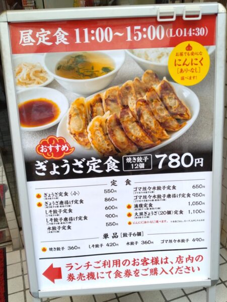 神田西口商店街を進んでいくと、「ぎょうざ定食」のたて看板。