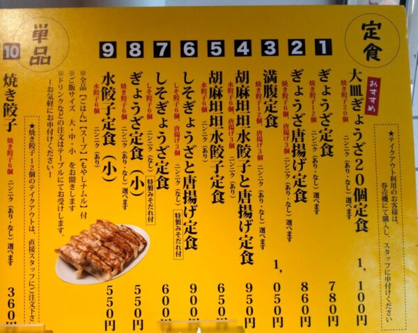 表の看板にもあった、焼き餃子の「ぎょうざ定食」を先頭に、水餃子、胡麻担々、しそ餃子。